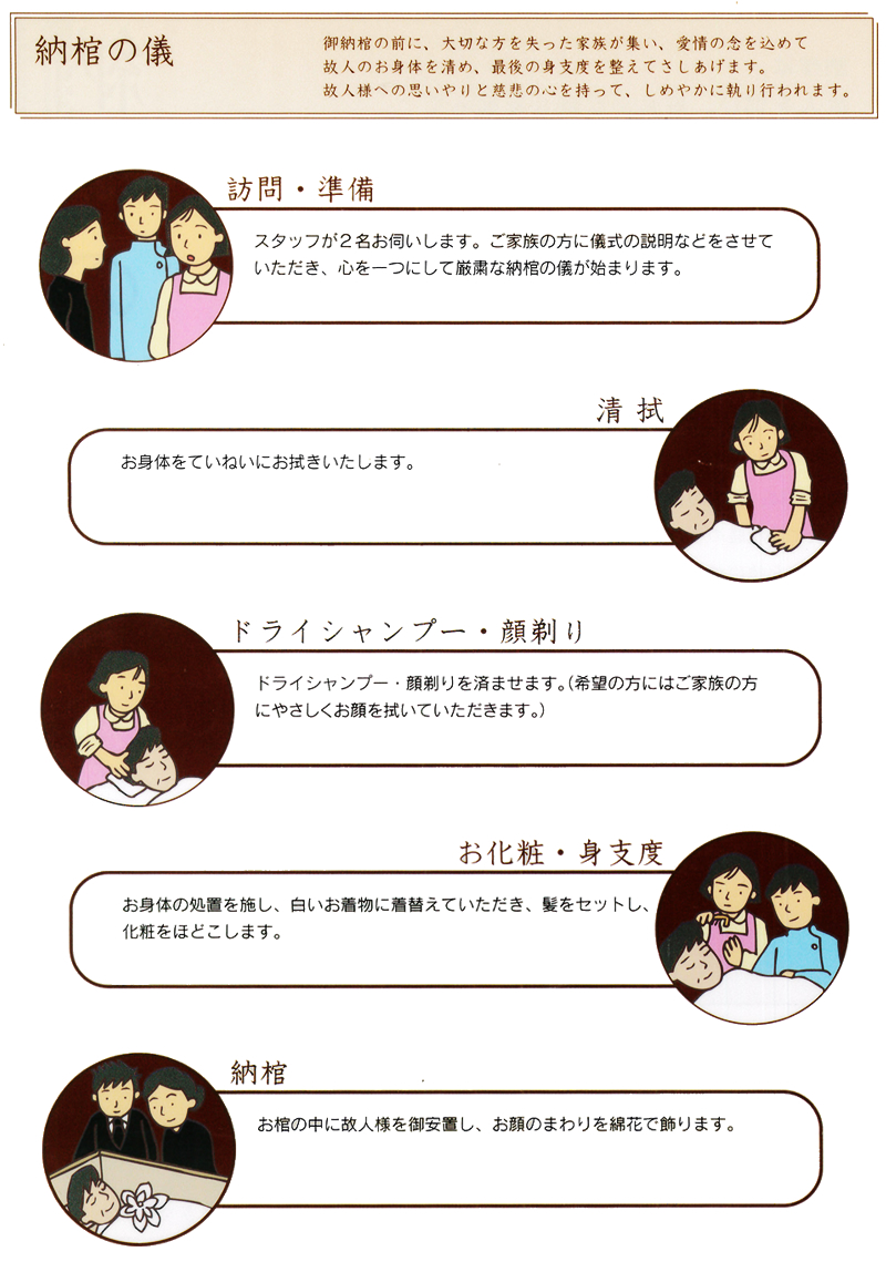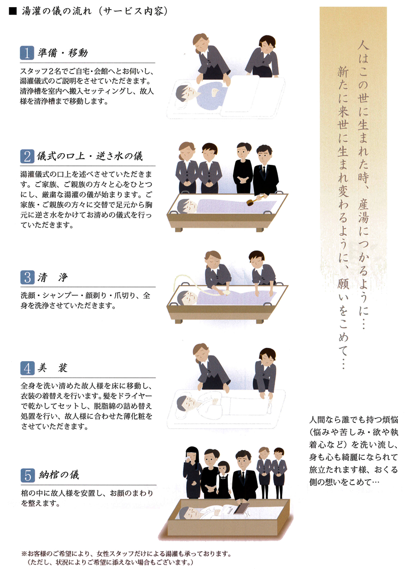 湯灌(ゆかん)とは、故人様の体や髪を、お湯で洗い清め、化粧を施し、身支度を整え納棺することをいいます。